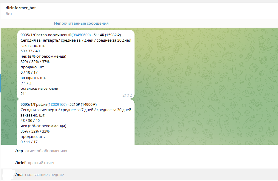 Сервис интегрирован с Telegram-ботом. В Telegram можно не только получать всю отчетность в реальном времени, но и управлять системой, оперативно отслеживать изменение ситуации с продажами, поставками и т.п.